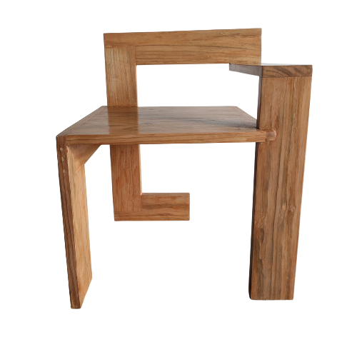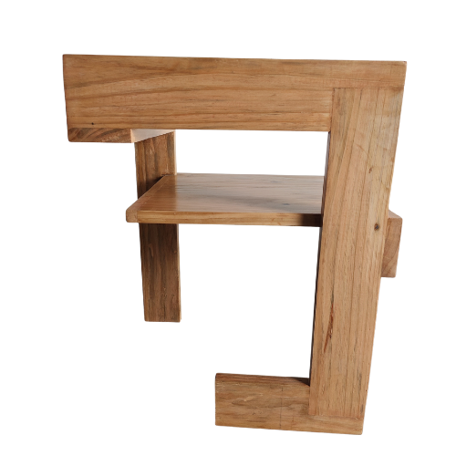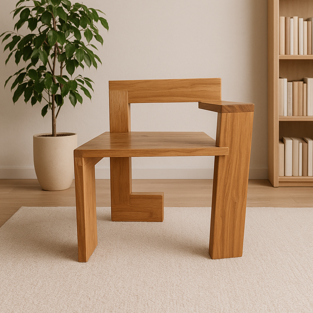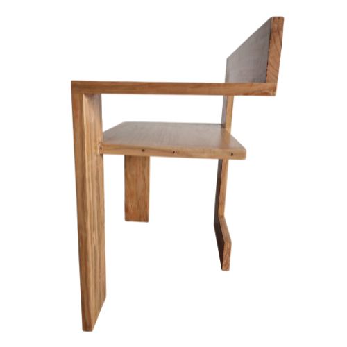 Crafted from solid wood with precise, interlocking construction, the Steltman Chair captures attention with its minimalist yet daring form. Its design challenges traditional symmetry, offering a left- and right-handed version that invites reflection on balance and form.